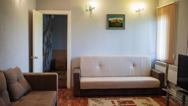 Двухкомнатные номера «Комфорт+» – отличный выбор для большой компании друзей или семейного отдыха. В спальной комнате – двуспальная кровать, прикроватные тумбочки, большой шкаф для одежды. Гостиная комната оборудована дополнительным спальным местом. Также в гостиной есть журнальный столик, телевизор, холодильник, шкаф для одежды, сплит-система.